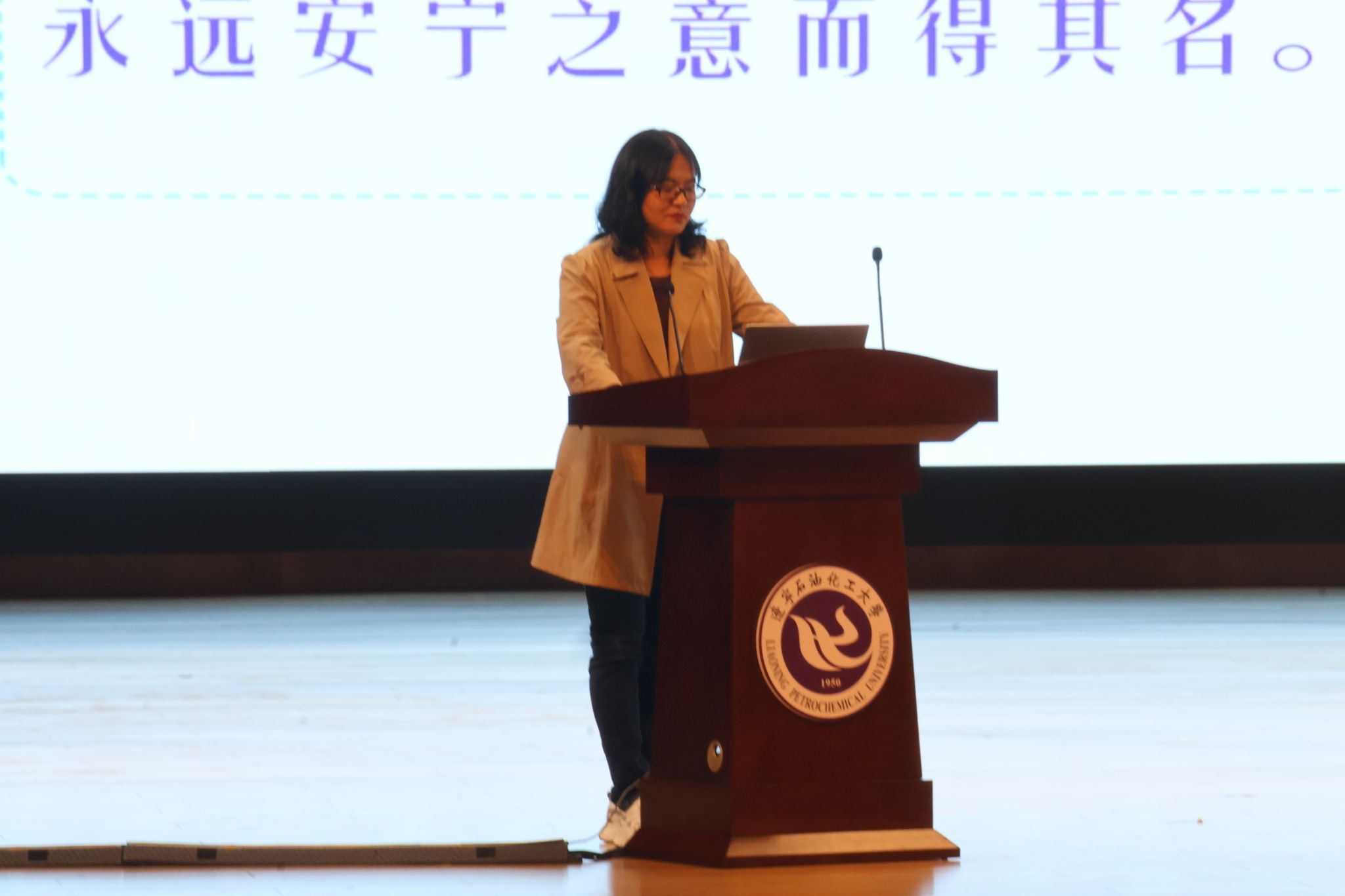 随后,范宁老师详细介绍了学校的历史沿革、“问学穿石,修身诚化”的校训、“抚油现象”“雷锋五个一精神”、学院的发展历程。此外,她还详细讲解了学院学科发展和办学优势,使新生对学院有了更深入地了解。