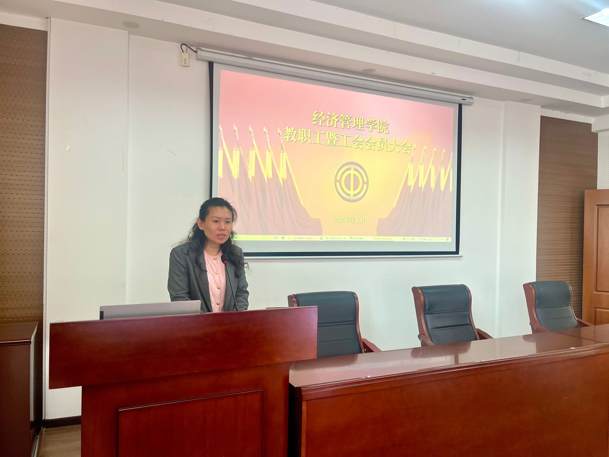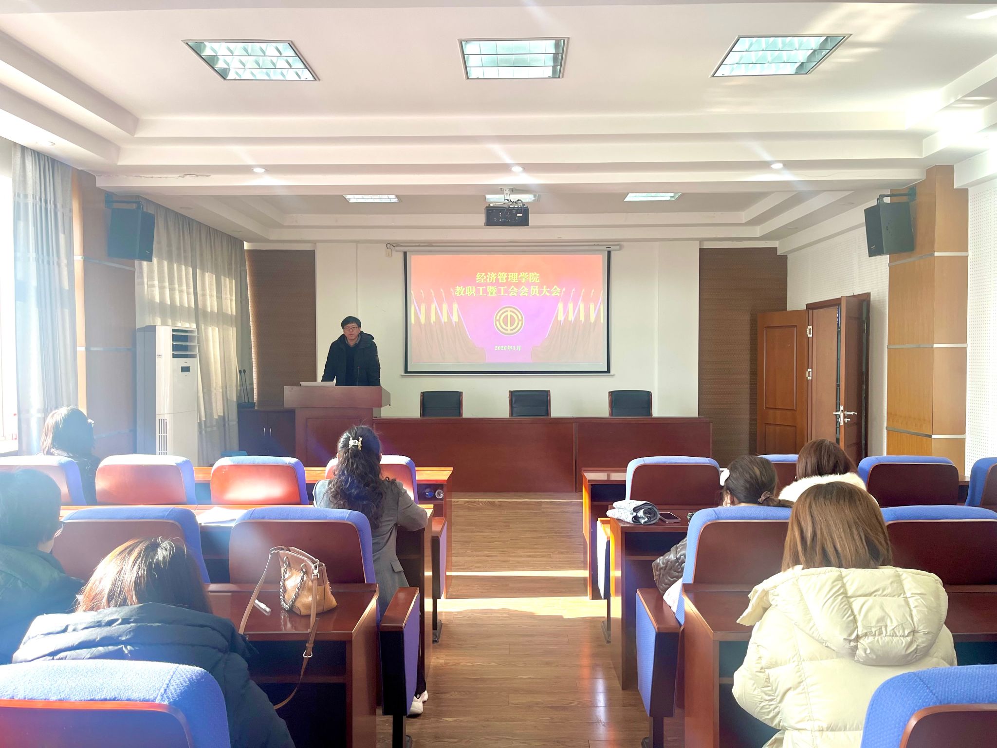 2026年1月8日上午11时,辽宁石油化工大学经济管理学院教职工暨工会会员大会在学院办公楼学术报告厅召开,全体工会会员参会,共商发展大计,大会由工会主席崔笑宇主持。
